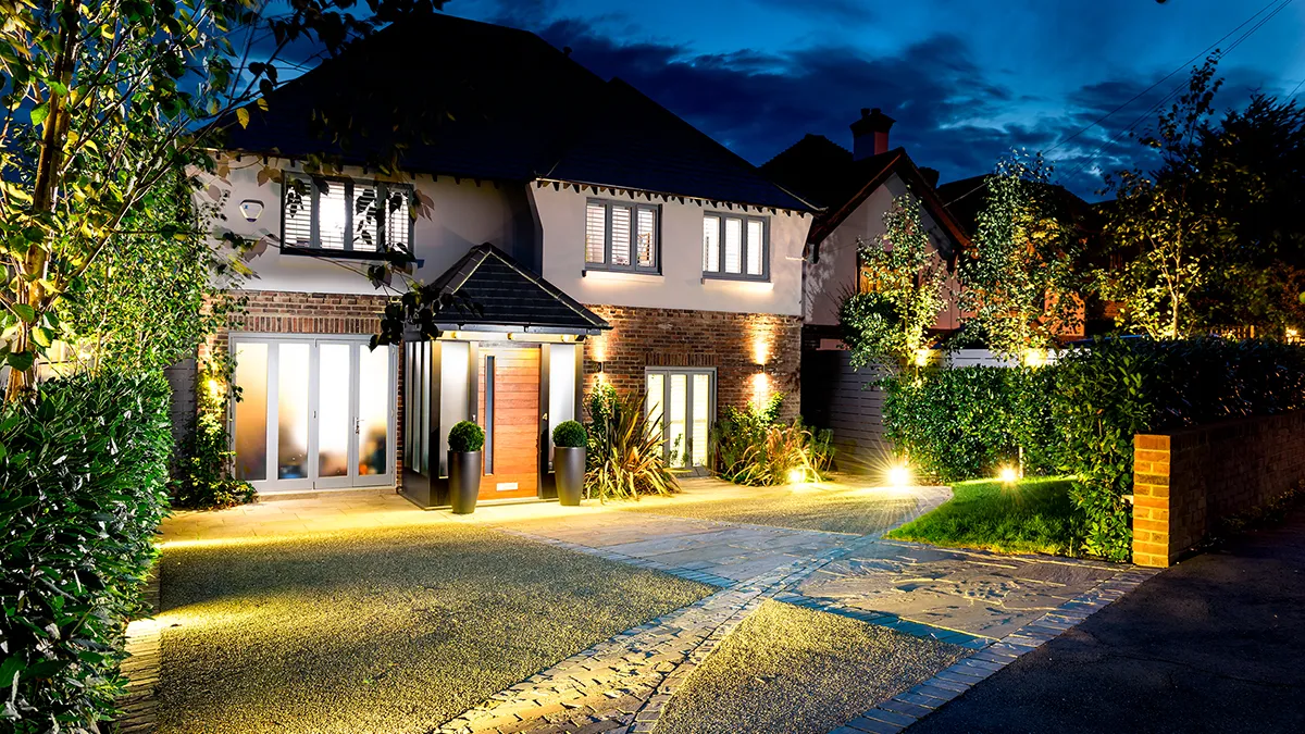 A fluent, eloquent front of house with space for numerous vehicles to park simultaneously and a welcoming approach to the front door. A transformation from a previously awkward dis-functioning space with many varied levels. Features include a resin bound driveway, cobbled pathway, low maintenance planting with silver birch trees.
