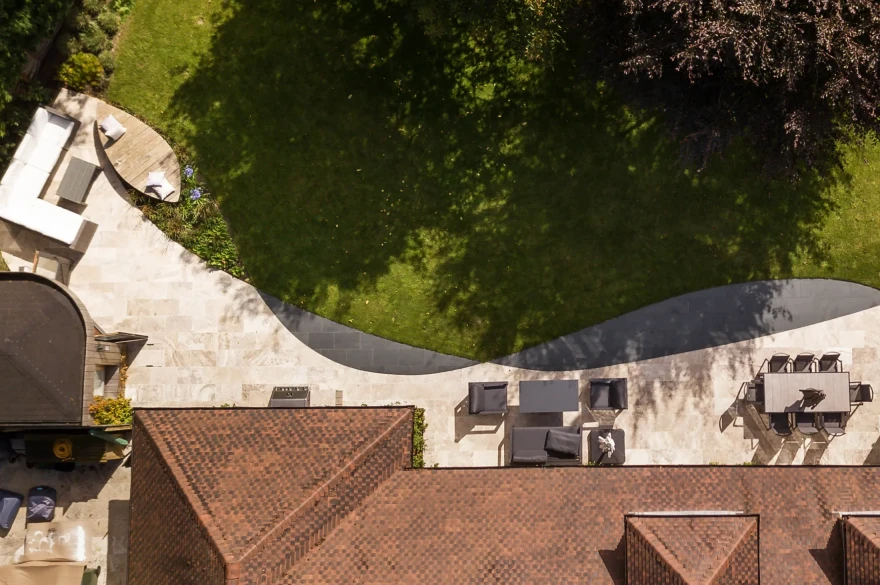 Unambiguous, effortless garden design that unites with the natural setting. A meandering patio terrace with organic detailing envelopes the rear of the property. The family can enjoy dining out, lounging, cooking and playing music in a bespoke curving garden room. Leaf shaped daybeds frame the beautiful setting.